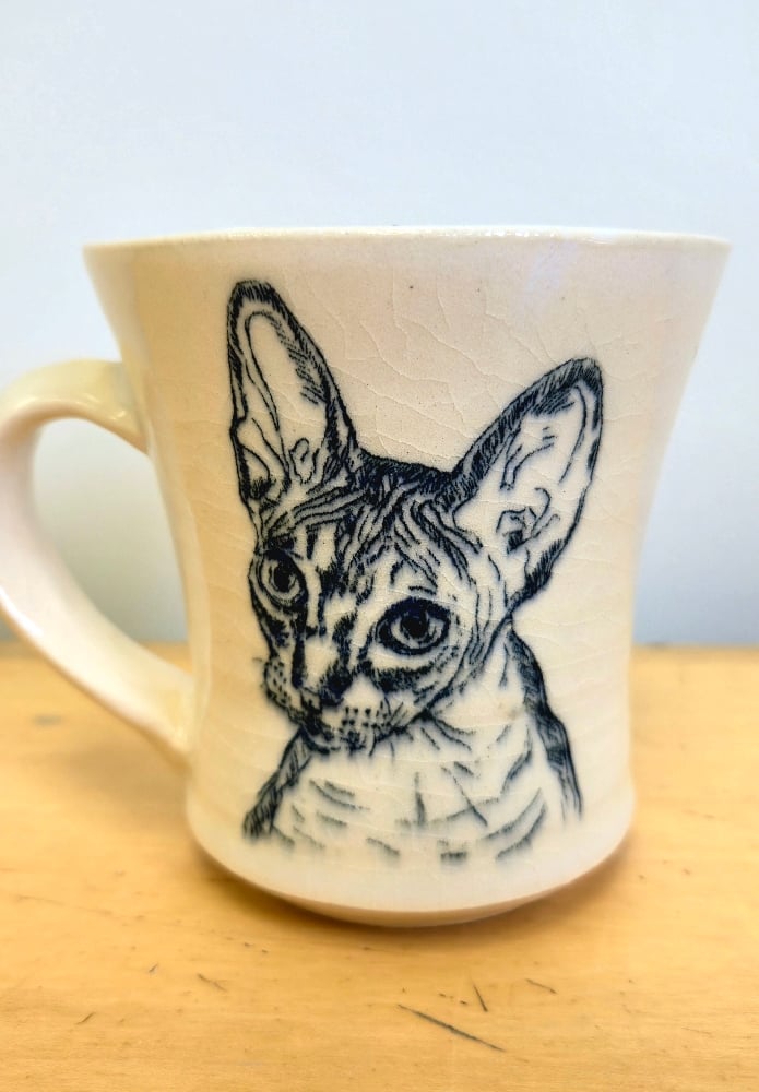 Wheel thrown, stoneware mug with cat underglaze transfer
